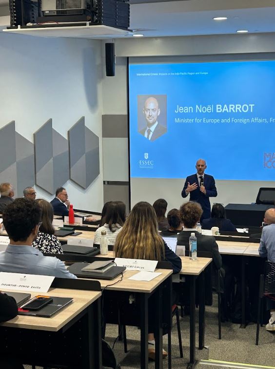 On March 25, 2025, ESSEC Business School’s Asia-Pacific campus hosted French Minister Delegate for Europe, Jean-Noël Barrot, and H.E. Stephen Marchisio, Ambassador of France to Singapore, for a high-level conference on “International Crises: Impacts on the Indo-Pacific Region and Europe.”