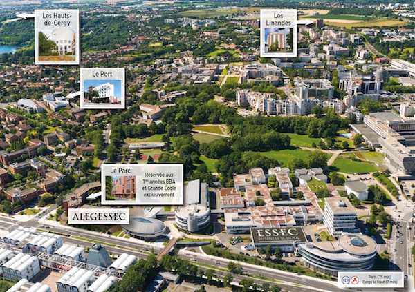 À Cergy-Pontoise, l’ESSEC vous propose quatre résidences étudiantes pour profiter de tous les avantages de la vie du campus dans un environnement international, convivial et dynamique. L’ALEGESSEC (Association pour le Logement des Étudiants du Groupe ESSEC) loge un étudiant de l’école sur quatre et plus de 84 % d’étudiants internationaux.